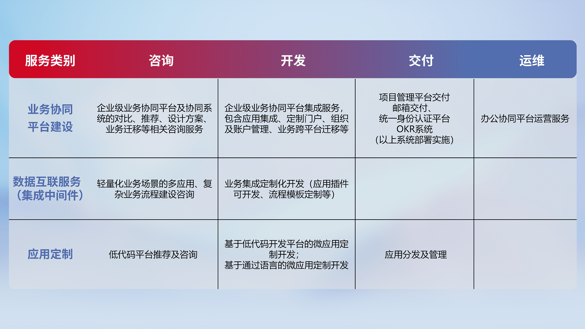 针对钉钉、、、企微、、、、IDaas等平台级产品提供产品的规划、、、方案、、、交付、、定制化开发等服务,,,,实现如统一协同办公、、、、智能客户服务、、、、混合会议管理、、、、智能数据查询、、、等业务场景,,,实现数字化转型。。。。